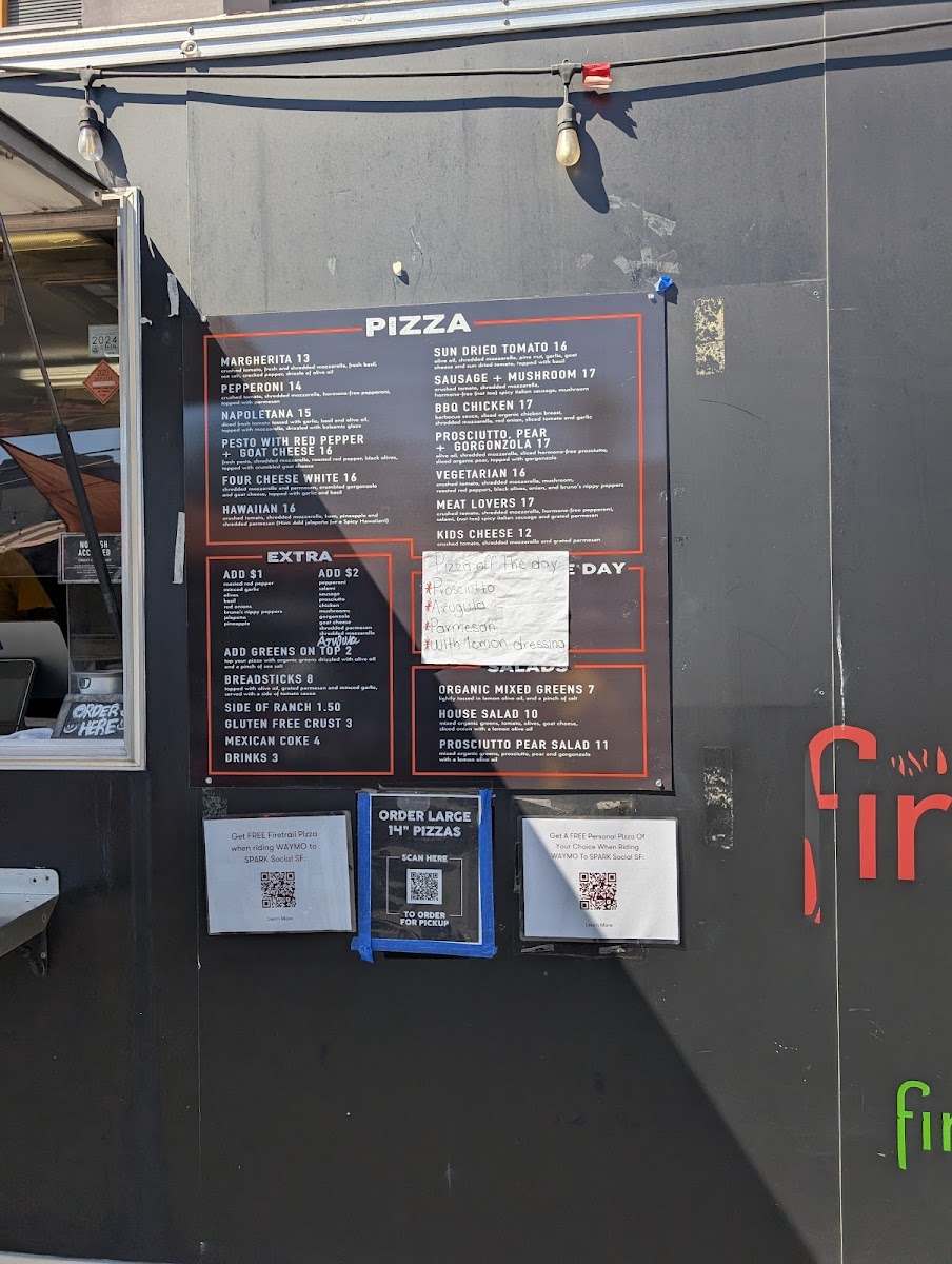 Firetrail Pizza Menu feels like a love letter to simple ingredients done well. Set in the heart of 601 Mission Bay Boulevard North in San Francisco, the pies here don’t try to reinvent the wheel - they let flavor do the talking. The crust is thin and crisp, with just enough chew to hold its own under generous toppings. Their classic margherita brings bright tomato and fresh basil together in a way that never fails, while the spicy sausage option hits with a smoky kick that fans of heat will appreciate.